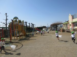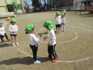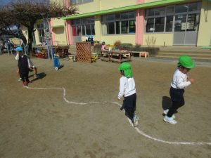 ↓2チームに分かれ、両端からスタートして、ぶつかったところでジャンケンをする遊びも楽しいようで、誘い合って遊んでいます。