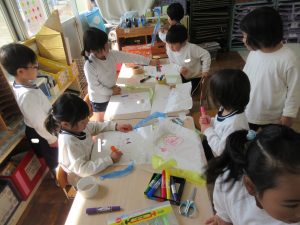 ビニール袋に絵を描き、どんな紐をどこに付けるか、子どもたちが考えて作っています。