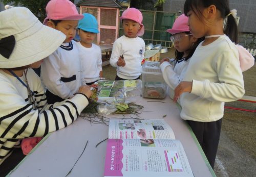 先月から歌っている🎵こおろぎ🎵の歌の歌詞の「ころころりん ちろちろりん」を口ずさむ子がいました。鳴き声は聞こえませんでしたが、近くで見る事ができきるのも自然ならではだと思います。