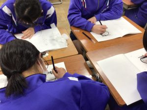 合渡マルシェで、多くの生徒が、地域に住む國江様に笑い文字を書いていただきました。