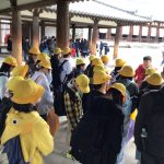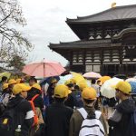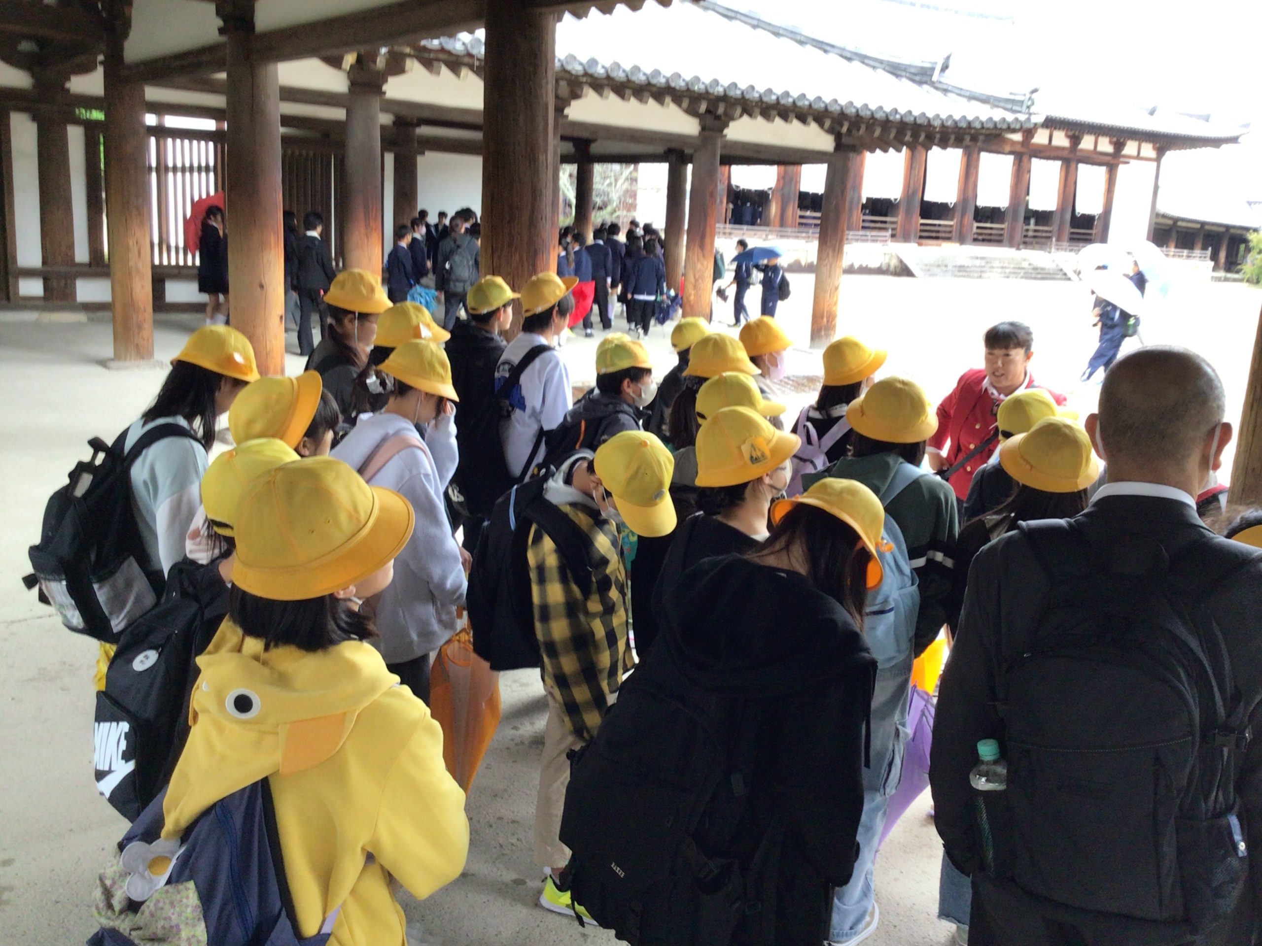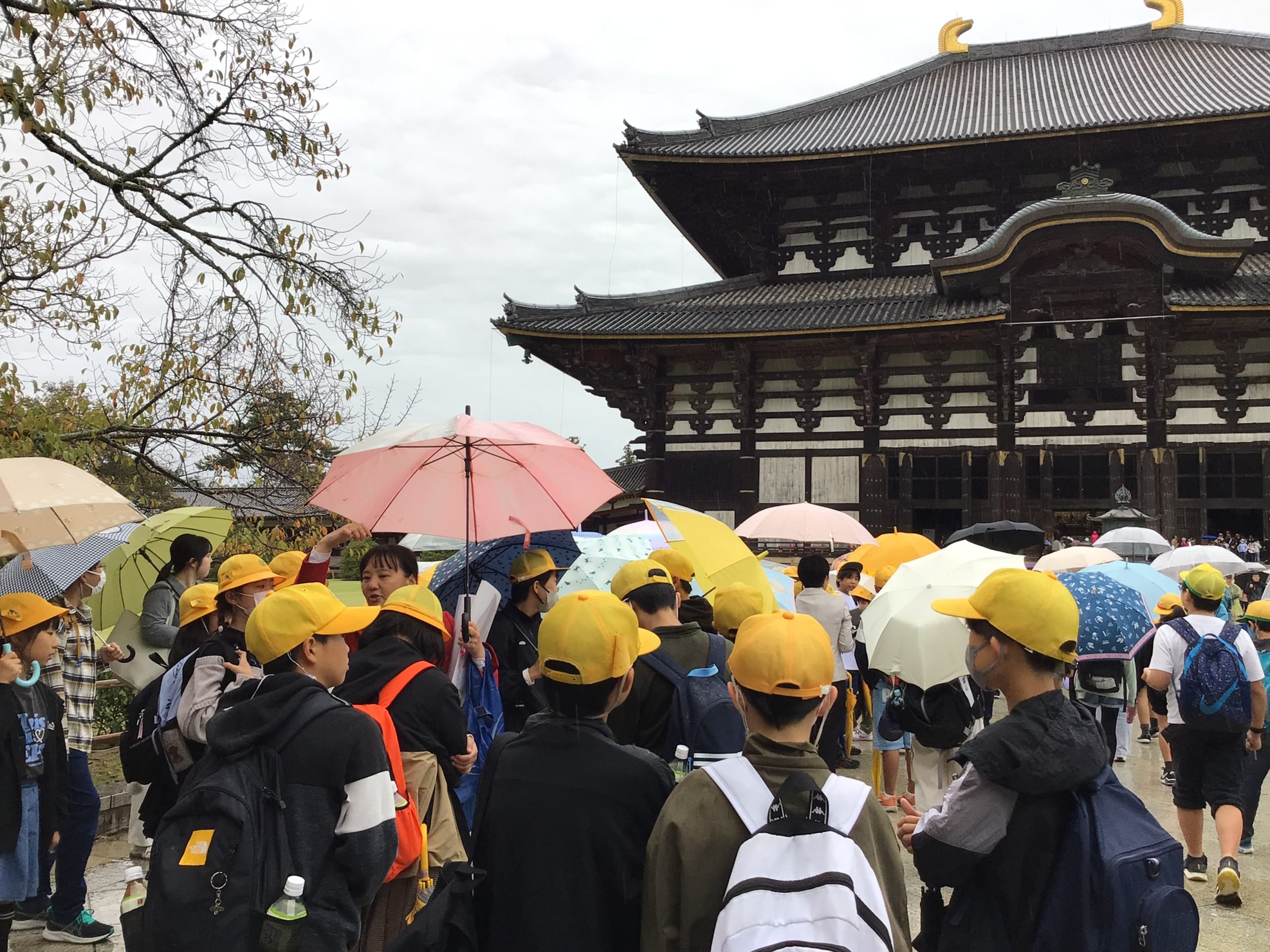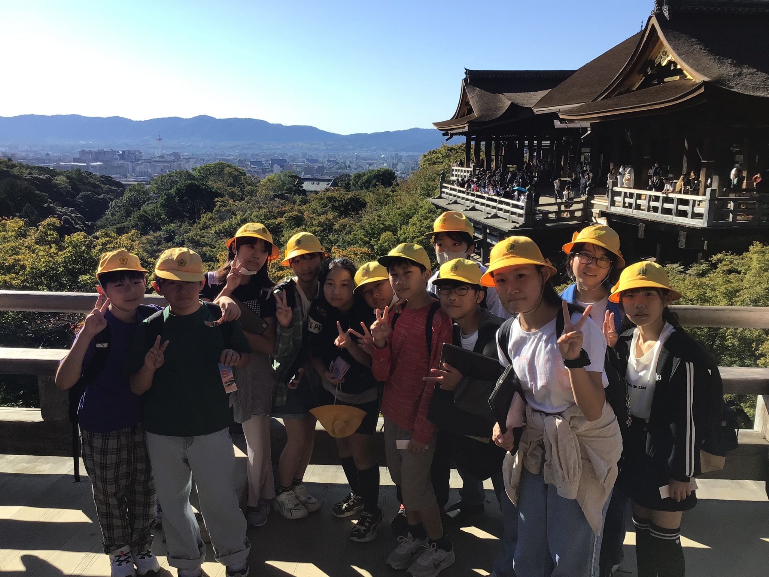 10月22、23日に奈良・京都へ行きました。1日目は小雨が降り続く寒い天候になりましたが、法隆寺や東大寺などを見学し、社会科で学習したことについて学びを深めることができました。2日目は、写真のような快晴のもと、各班で計画した見学場所をまわりました。どの見学場所も大勢の人がいましたが、タクシーガイドさんの案内で予定していた場所を順調に見学することができました。