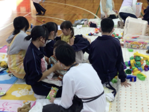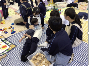 講師の方と事前学習を行なっていた生徒たちでしたが、いざ交流が始まると、どのように関わればよいか戸惑う様子も見られました。親御さんと離れて泣き続ける子、楽しそうに遊び始める子、乳幼児の反応は様々でした。
