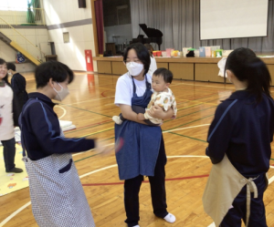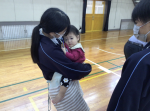 活動開始時は、つかぬ間自由な時間を過ごせる、という嬉しそうなお母さんの表情、別れ際に泣く我が子に後ろ髪を引かれる様子のお母さん、そして普段接する機会のない幼い子に戸惑い、泣き叫ぶのをどうなだめようかと恐る恐る手を差し伸べる生徒たちの姿が印象的でした。
