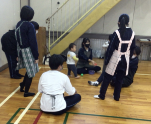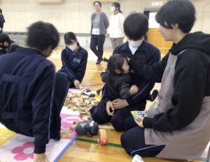 親御さんが帰ってくると、ほとんどのお子さんがニコニコしていて、お母さんもホッとした様子でした。短時間でしたが、自分時間を楽しめたとの感想を頂けたり、生徒達も貴重な経験ができたりと、すばらしい行事だと思いました。コロナ禍を除く17年間続く乳幼児ふれあい体験、これからも続けていってほしいと思います。
