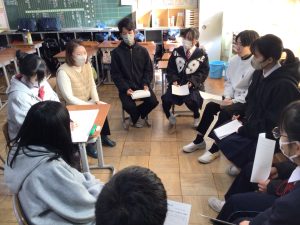 1月14日の「いじめを見逃さない日」には、約50名の地域や保護者の方々に来ていただき、大人と子どもが一緒になっていじめ未然防止に向けて考える活動を行いました。4月からいじめ未然防止に向けて何度も話し合い、心を育ててきました。しかし、HEROSでは、まだ誰もが安心して生活できる場とは言い切れないのではないかという思いから、今回の話し合いのテーマは「誰もが本当に安心して暮らせる学校にするために、さらに大切にしたい心は何か。」になりました。生徒たちだけではなかなか答えを出すことが難しいテーマの中、大人の方々が生徒の気持ちに共感してくださったり、違う角度からアドバイスをしていただいたりしたおかげで、話し合いが深まりました。今後も地域や保護者の方々とつながり、いじめを生まない安心して生活できる東長良中学校区でありたいです。今回参加いただいた皆様、お忙しい中ご来校いただき、大変ありがとうございました。