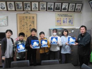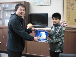 学校代表の6年生の子とFC岐阜の担当者の方と、校長室で贈呈式を行いました。