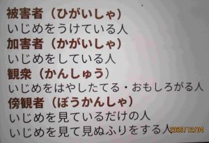 いじめには、「いじめの四層構造」があって、大きく分けると4種類の人(立場)がいるということも分かりました。