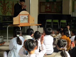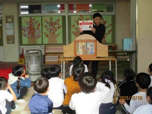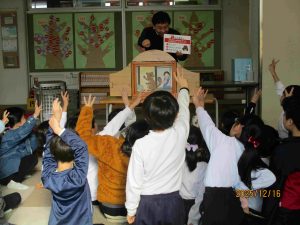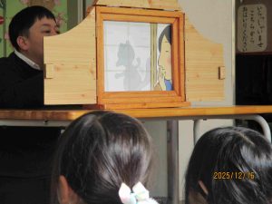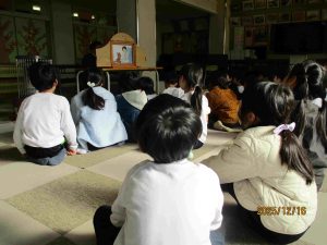 そして、楽しい原作を紙芝居で見させてもらいました。みんな教科書のお話と違うところにも気が付くほど、集中して見聴きしていました。