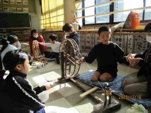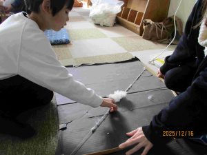 1年生の子ども達は、おかみさんやたぬきさんみたいに、上手に綿から糸に紡ぐまでの体験ができていたので、講師の方々からどの子も「上手だね!」と褒めてもらいました。
