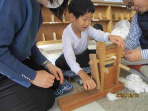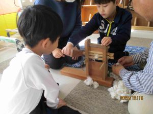 その後、子ども達は一人ひとり、「綿操り(綿から種を取り除く)」や「糸紡ぎ」などの体験をさせてもらいました。