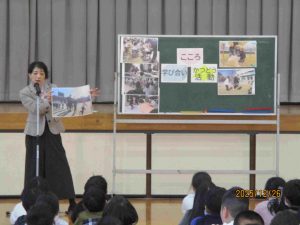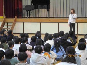 全校集会では、校長先生から、後期が始まってからの ”全校の宝物” の話がありました。全校のみんなは、自分たちが取り組んできたことの確かめをしながら、うなずいて反応したり、「はいっ!」と返事をしたり、笑顔で嬉しそうに聞き入っていました。