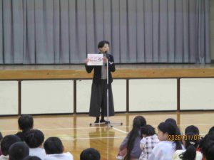 全校朝会でも、校長先生の話や生徒指導の先生の話をしっかり聴いて、3月の学年の終わりまでに「こんな風に頑張るよ」という気持ちで、返事をしたり反応したりするなど、自分で確かめていました。