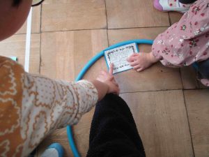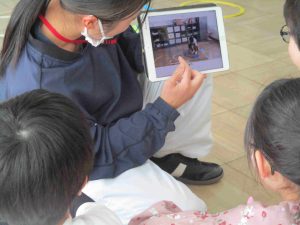 ルールがよく分かるように、先生と一緒にお手本の動画を撮っておいたのを見てもらいました。二人ともすぐに分かってもらえたので、早速大きなサイコロを振って遊びました。みんなカードがある所にとまって、そのお題に答えるのがおもしろかったようです。