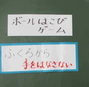 次に「ボールはこびゲーム」をしました。二人一組になって、ふくろの上にボールを運んでかごに入れます。