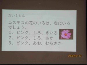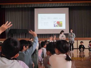 全校のみんなに興味をもってもらえるように、学校の校庭にある樹木や花などについて、低学年の子たちにも分かりやすいクイズを取り入れながら、次に行うイベント「写し絵」の紹介をしていました。