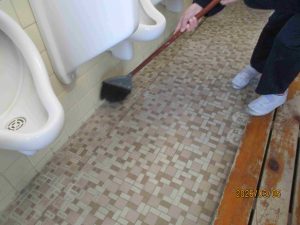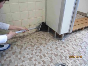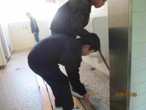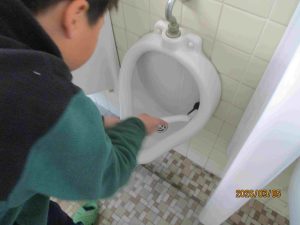 3年生の子たちも、それぞれに便器の汚れを取り始めます。「上手、上手。」「落ちた、落ちた。いいよ。」