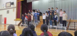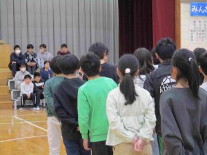 1年~5年生は、6年生に感謝の気持ちを伝えるために、気持ちのこもった言葉や歌、リコーダー演奏で伝えました。