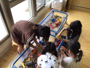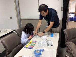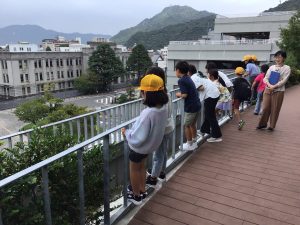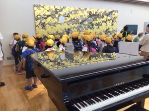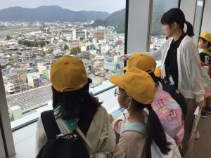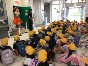 10月7日(火)にドリームシアター岐阜と岐阜市役所へ校外学習に行きました。ドリームシアター岐阜では、職員の皆様に温かく迎えていただき、工作を教えてもらったり、4階、5階「子どものフロア」にあるたくさんの遊具や楽器で遊ばせてもらったりと、多くの楽しい体験をすることができました。午後からは、岐阜市役所へ移動して、管財課の職員の皆さんに17階の展望スペース「つかさデッキ」や4階「みどりの丘」、1階の市民窓口などを案内していただきました。特に1階の市民スペース「ミンナト」に飾られた絵画には、金華山や長良川、岐阜市役所や花火などの他に日野小学校も描かれており、みんなで楽しく鑑賞することができました。この身近な施設やそこで働く人々と触れ合った体験を生かして、今後のおもちゃランドや町探検などの学習に取り組んでいきます。朝早くからお弁当やペットボトルの準備ありがとうございました。おかげで元気に過ごすことができました。