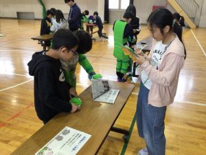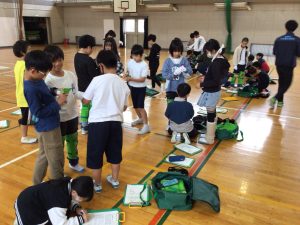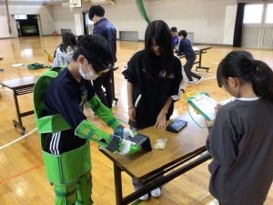 総合の学習として、高齢者疑似体験を行いました。高齢者の方はどのようなことに困っているのかを明らかにするために、実際にサポーターやゴーグルなどを着用し、新聞を読む、瓶の蓋を開ける、箸を使うなどの日常の動きに挑戦しました。思ったように体が動かないことや、見えにくいことに驚いていました。この経験を通して、これからの授業で自分たちには何ができるのかを考えていく予定です。