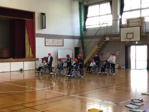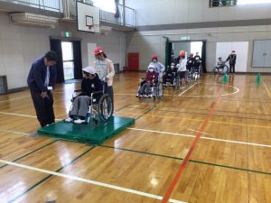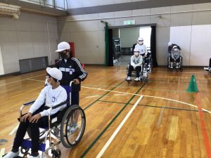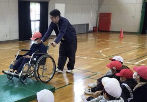 福祉協議会の方から車いすの操作方法を教えていただき、実際に乗ったり、押したりしました。
