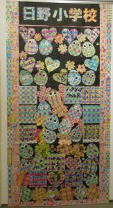 今年のふれあい教育展には「折染」の作品を出品しました。1人3枚づつ自由に色を染めました。最後に水をつけて色を馴染ませると本当に浴衣の柄のような素敵な模様が浮かび上がりました。それを桜の形にしたり、卵の形のキャラクターにしたり、自分の好きな言葉を書いたりして3クラスでひとつの作品に仕上げました。とても見栄えのある、華やかなものになり、来場者の方の目を引く作品になりました。