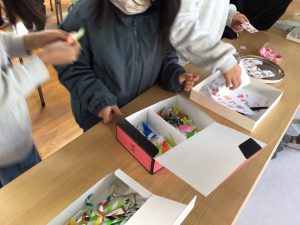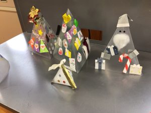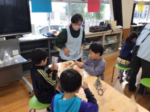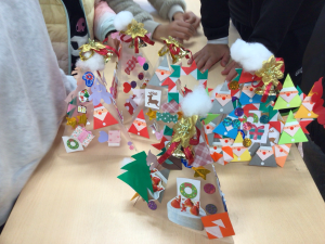 12月11日(木)、日野っ子メイツでクリスマスツリーを作りました。クリアファイルで作った三角錐に、子どもたちは目を輝かせながら飾り付けを始めました。「この面はおうちの中にしよう」「ここはお庭にしよう」と物語を膨らませながら飾る子、色とりどりのサンタクロースを並べて「もっとにぎやかにしたい!」と工夫する子…。笑顔と歓声があふれ、会場はまるで小さなクリスマス工房のようでした。