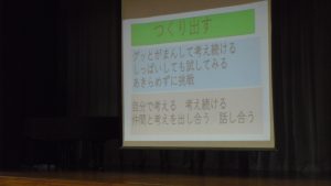 みなさんも、後期、つくり出すことを頑張りましょう。それは、絵を描いたり、工作の作品をつくったりという、目に見えるものをつくることだけではありません。頭の中で考えたり、仲間と話し合っていくうちに、だんだんと考えがまとまっていったり、「あーこうしてみたらいいんじゃない」と、新しい考えが生み出されたりする。それが、「つくり出す」ということです。