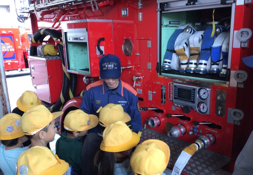まずは、岐阜中消防署東分署で、施設内見学と消防車や救急車を見学しました。「大規模風水害対策車」の大きさに驚き。団地が多いこの地区は、はしご車は16.1mと、地域に合わせた車が準備されていることをしり、くらしを守ることについて学びを深めました。担任の先生方がその高さを体験すると、「わぁ~!!」と、うらやましいような怖いような子どもたちの歓声が響いていました。