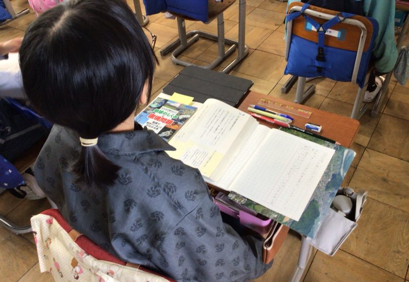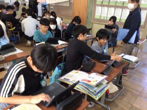 前の時間までにできていた構成メモをもとに、自分で適切な資料を選んで文章を書いていきます。5年生のみなさんは、本当に素晴らしい姿をたくさん見せてくれました。自然に近くの子に尋ねたり、確かめたりして、どんどん書いていく子。テレビ画面に映されている参考となる文章を見に行く子。分からないことを先生に質問しながら書いていく子。全員が出席し、だれ一人残さず、それぞれが自分で決めた方法で45分間しっかり学習をしていて、参観していた先生方から「すごい!」と感嘆の声が思わず出るほどでした。本当にすばらしい「自ら学び、つくり出す」姿を見せてくれていました。