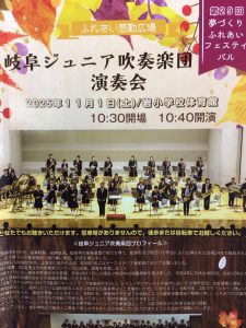 そのあとは、「ふれあい感動広場」として、「岐阜ジュニア吹奏楽団演奏会」が行われました。小中学生を中心とした方の演奏はなじみのある曲が多く、思わず体でリズムをとって聴いてしまう、すてきな演奏でした。楽器演奏に興味を持った子もいたようです。