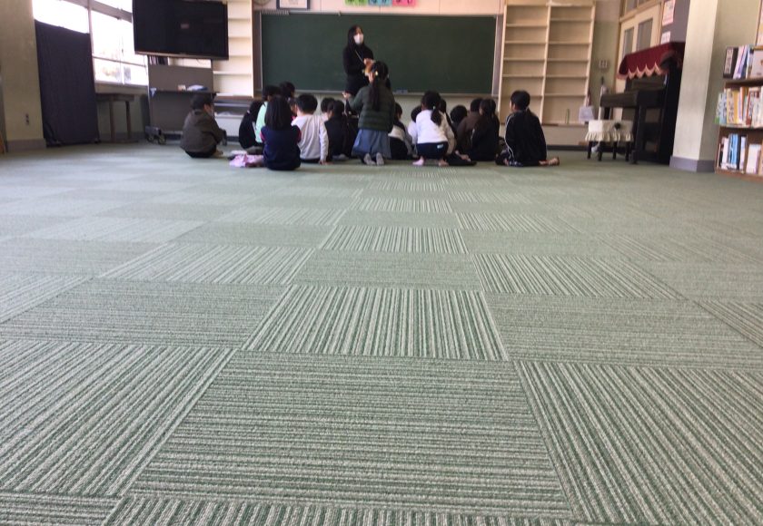 ワークスペースのじゅうたんを新しく張り替えていただきました。グリーンを基調にした落ち着きつつ明るい部屋になりました。カーペットの色は図書委員さんの意見を参考にして選びました。これで、床に本を広げて読むのも気持ちがよいです。さっそく、学校司書さんが1年生さんに読み聞かせをしていました。