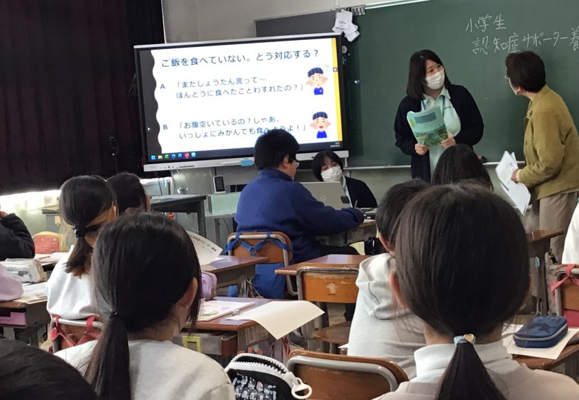 4年生が認知症サポーター養成講座を行いました。地域包括支援センターから講師の方にお越しいただき、地域みんなで認知症の方も暮らしやすい町にしていこうという学習を一緒にしました。