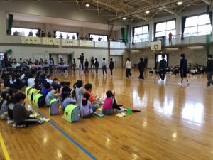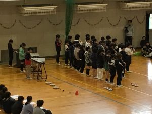 はじめに、なかよし班ごとに遊びをしました。これまでのお礼の気持ちを込めて和やかな雰囲気で微笑ましい時間でした。