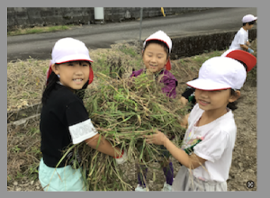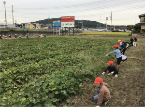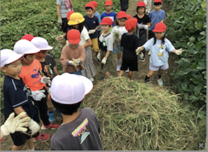 5月に植えたさつまいもの苗がとても大きく成長していてびっくりしました。「葉っぱがハートみたい。私の手より大きいよ。」「茎が紫色だよ。」など、苗の様子を観察した後、みんなで草を抜きました。収穫がとっても楽しみになりました。