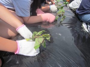 生活科「ぐんぐんそだて わたしのやさい」の学習で、サツマイモの苗植えを行いました。JAの職員の方を講師に迎え、苗の植え方や世話の仕方について教えていただきました。苗の植え方には、何種類もあることを知り、子どもたちの「大きな実がなる『垂直植え』がいい」という願いで、今回は垂直植えに挑戦しました。