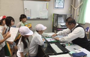 生活科の学習で,学校探検を行いました。1年生が2年生のお兄さん,お姉さんと手をつないで歩きました。北舎1階の職員室・校長室・保健室や,南舎3階の図書室などをみんなで探検し,「ここが校長室だよ。失礼します。って言うんだよ。」「シール,ここに貼るんだよ。」と,2年生が優しく1年生にお話する微笑ましい姿がありました。1年生は,2年生の話を聞きながら「学校って広いな~。」