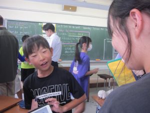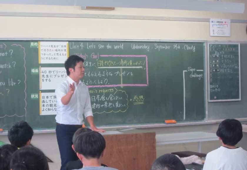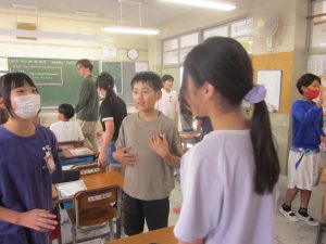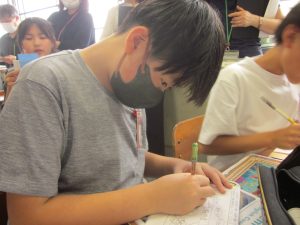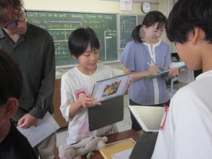日本国内での旅行を考えているALTに対して、日本のおすすめの場所について伝える内容を考える活動を通して、I’m going to talk about my favorite place in Japan./ You can ~ ./ It’s ~.などの表現を使って、説明や感想を伝えて、プレゼンをつくりました。目的・場面・状況に応じ、内容と英語表現を考え、自分に必要な学習方法を選択し、取り組むことができました。