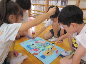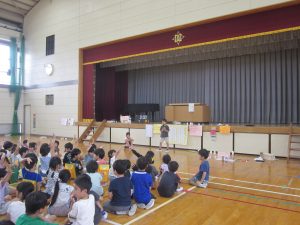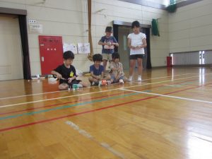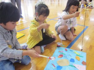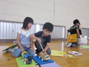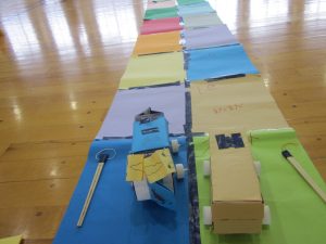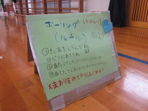おもちゃランドには、「ぴょんコップ」「ボーリング」「じしゃく魚つり」「まとあて」「パッチンジャンプ」「紙とんぼ」「玉入れゲーム」「びゅんびゅんカー」「おにんぎょうコーナー」「とことこ車」「とばせ かみトンボ」「ぱたぱたカーレース」などのたくさんのブースが準備されていました。どのブースも、看板、景品づくり、楽しんで遊んでもらえるルールづくりなど、たくさんの工夫とアイディアがありました。1年生が「楽しかった。また遊びたい。」と、教室に戻ってからも話すぐらい盛況でした。