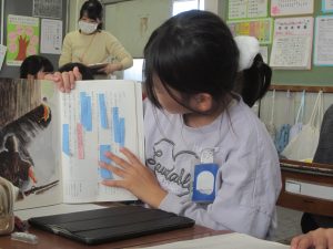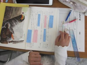中学年部の「学年部研究会」を行いました。4年2組の国語の授業で、「ごんぎつね」の学習を職員で学び合いました。各自が単元の導入で作った学習課題の解決に向けて、一人読みの時間を大切にし、自分なりの考えをもつことや、小集団交流や全体交流を通して、読みを深めることを大切に学習を進めてきました。一人読みの場面では、「言葉にこだわって読みを深めさせたい」という授業者の願いの下、登場人物ごとに色を変えてサイドラインを引いたり、サイドラインと同じ色の付箋にその時の気持ちを想像して書いたり、学習活動にも工夫が見られました。
