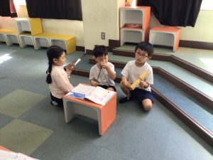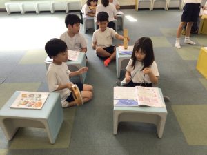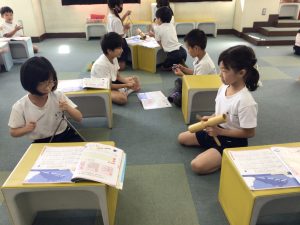 2年生では、音楽の学習で「いるかは ざんぶらこ」に取り組んでいます。3拍子のかんじを出すには、どの楽器を組み合わせるとよいか、いろんな楽器を鳴らしながら楽しく考えることができました。仲間との対話も活発で、大変意欲的に学んでいます。