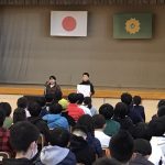 5時間目、3~6年生は体育館に集まり、児童会と報道局長に立候補した5人の演説がありました。