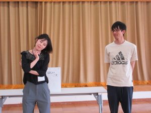 聾学校の先生が耳が聞こえる子ども役、加納幼稚園の先生が耳が聞こえない子の役をして、寸劇を子どもたちに見せました。
