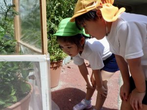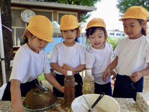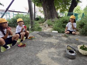 戸外にいることが気持ち良い気候になってきました。変わらずごっこ遊びが大好きな子どもたちは外でもごっこ遊び。