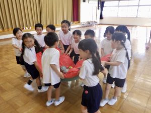 でも今はエンドレスリレー。審判役の子の「ストップ!」の合図で、勝敗が付きますが、勝敗は審判のさじ加減。「赤チームの方が頑張っていたから、赤チームの勝ち!」「青チームだって頑張ってたし。」「赤チームは少ない人数でも頑張ってたよ。」「えー、でもな〜・・・。」「じゃあどうしたらみんなが納得する勝ちや負けが決まるんだろうね?」子どもたちに投げかけながら、考えたり、遊びを作ったりしています。