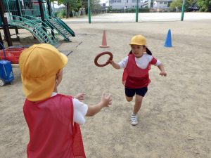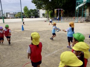 リレーを繰り返し楽しみながら、思い切り走る楽しさや気持ちよさを味わっています。