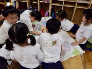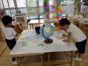 国名も国旗もついていない世界地図に国旗シールを貼っていって、自分たちの世界地図も作成中。「この国はどこだろう?」と探してみることで、見つかった時の嬉しさと、「この国こんなに大きいんだ。」とか「◯◯と◯◯は近い。」と新たな知識に繋がったり、「私が貼った国だ!」とちょっぴり身近に感じる気持ちも湧いたりしています。