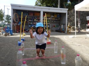 体を動かして遊べる場を用意すると、「できるよ。」とやってみる姿が見られます。足を揃えて膝を曲げ、手でバランスをとりながら紐の上を飛び越えています。できたことがうれしいので、私とハイタッチをし、一緒に喜んでいます。