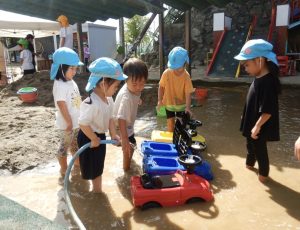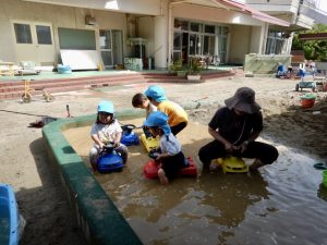 全身で水や泥の感触を味わって遊んでいました。気持ちを解放して友達と場を共有して遊ぶことがうれしくて、生き生きとした表情でしたよ。