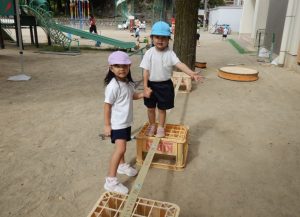 教師が手を支えたり、年中・長児が手をつないだりしてくれています。毎日、繰り返しやることで、『昨日はできなかったけれど、今日はちょっとできた』ということがやる気につながっています。友達や教師と一緒に体を動かして遊ぶ楽しさを存分に味わっていきたいと思います。