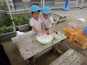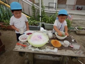 自分で、『この色のジュースが作りたい』と決めて根気よく作ったり、泡を入れて、「色が変わった!」と変化を楽しんだりしています。友達と見合ったり言葉を交わしたりして作っている姿がうれしいです。